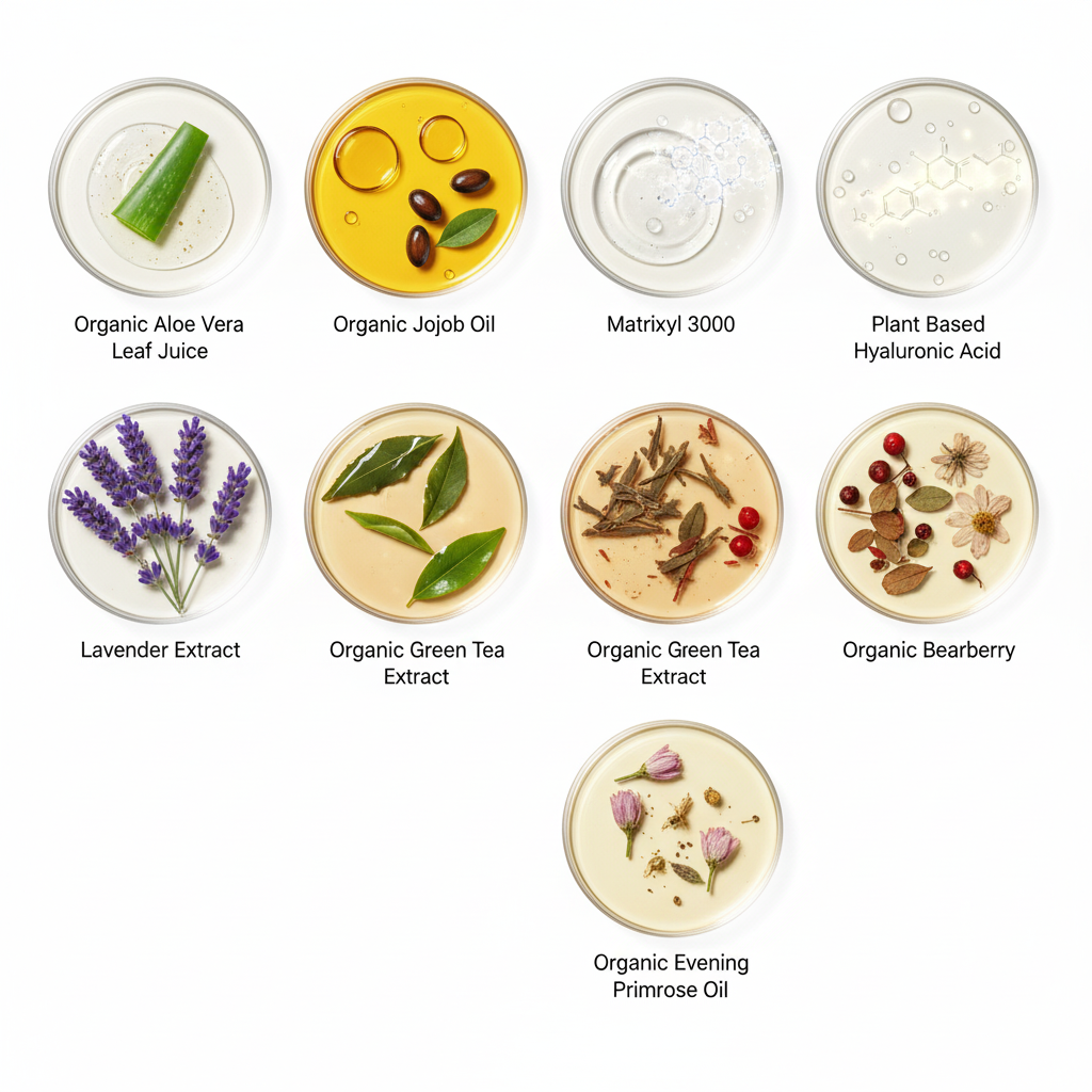 Organic Aloe Vera Leaf Juice, Organic Sunflower Oil, (Plant Based Hyaluronic Acid), Witch Hazel, Kosher Vegetable, Coconut Oil, Cocoa Butter, (Vitamin C), (Matrixyl 3000), Organic Evening Primrose, Jojoba Oil, Tamanu Oil, Green Tea, Bearberry Extract, Blueberry Extract, Organic Cranberry, Raspberry Seed Oil, Oregon Grape, Organic Licorice, Extract Cucumber, (Helichrysum Essential Oil), (Avocado Oil), (Geranium Essential Oil), Organic Rose Hip Oil, (Coenzyme Q10), (Vitamin E), Fruit Extract Orange Peel, (Apple), (Lemon), (peptides), Lemongrass, (Vitamin B5), aponica Flower Extract, (Organic Gotu Kola), (Horsetail), (Wild Geranium), (Organic Dandelion)*Certified Organic